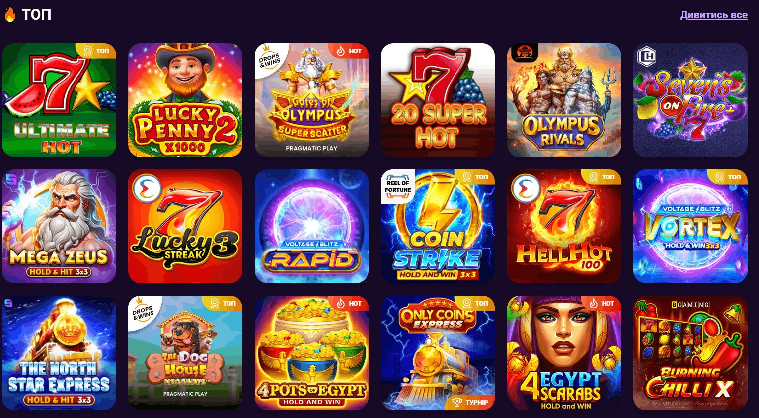 Найпопулярніший формат: різні тематики, механіки, бонусні раунди, фріспіни, джекпоти. Зручно, що слоти працюють швидко, а правила зрозумілі навіть новачкам.